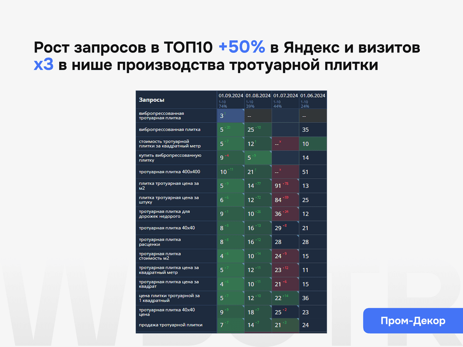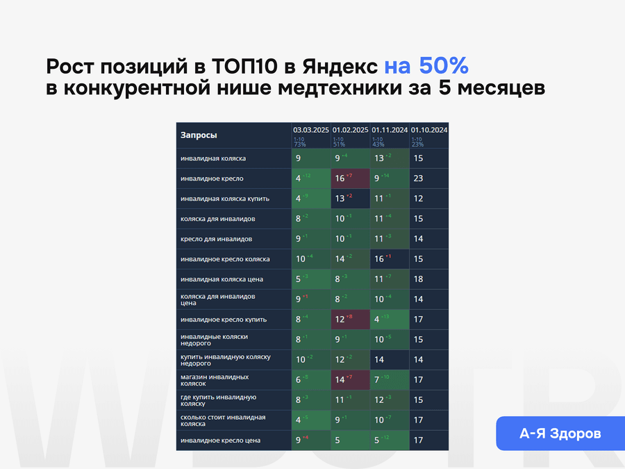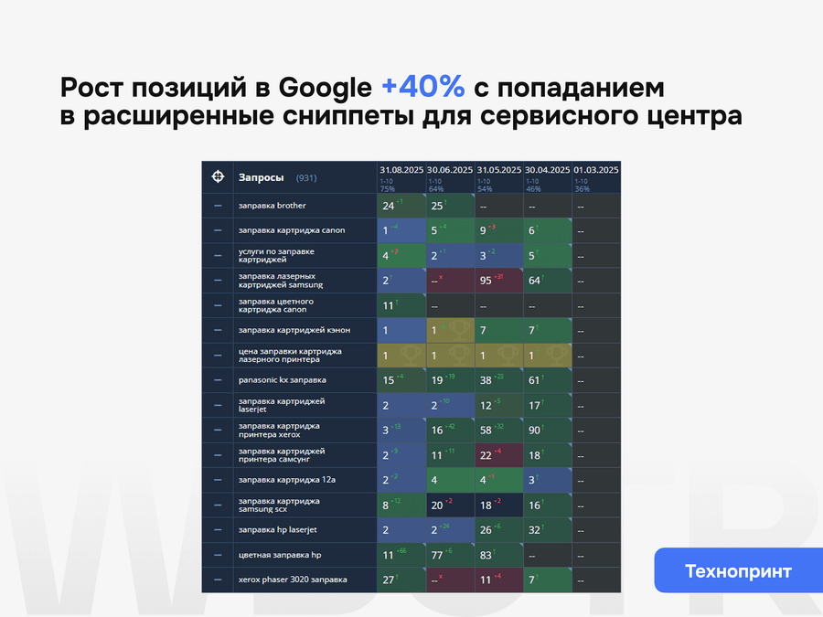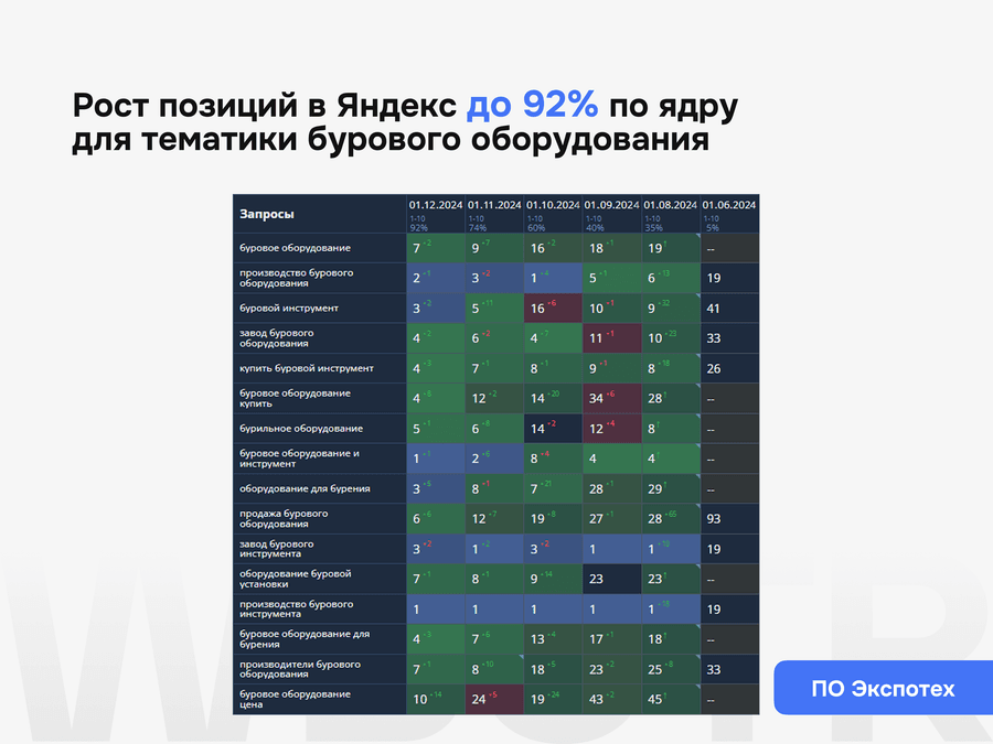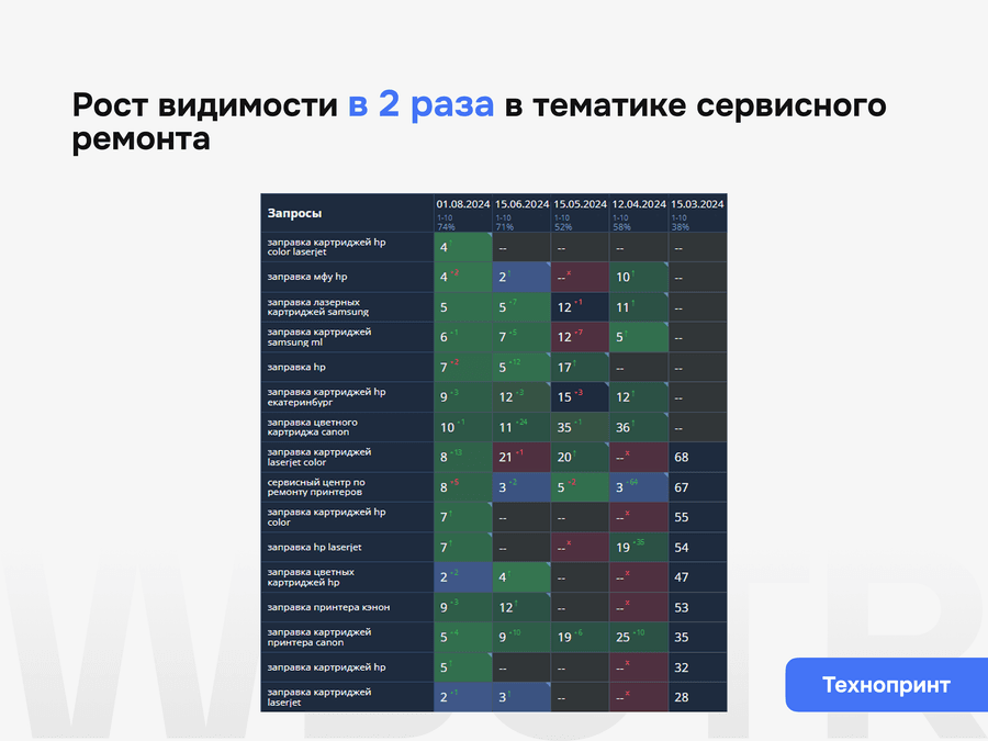 Мы смотрим не только на позиции, но и на рост видимости по кластерам, трафик на приоритетные страницы, клики, поведение пользователей и заявки. Для бизнеса важно не просто движение запросов вверх, а реальная отдача от целевого спроса.